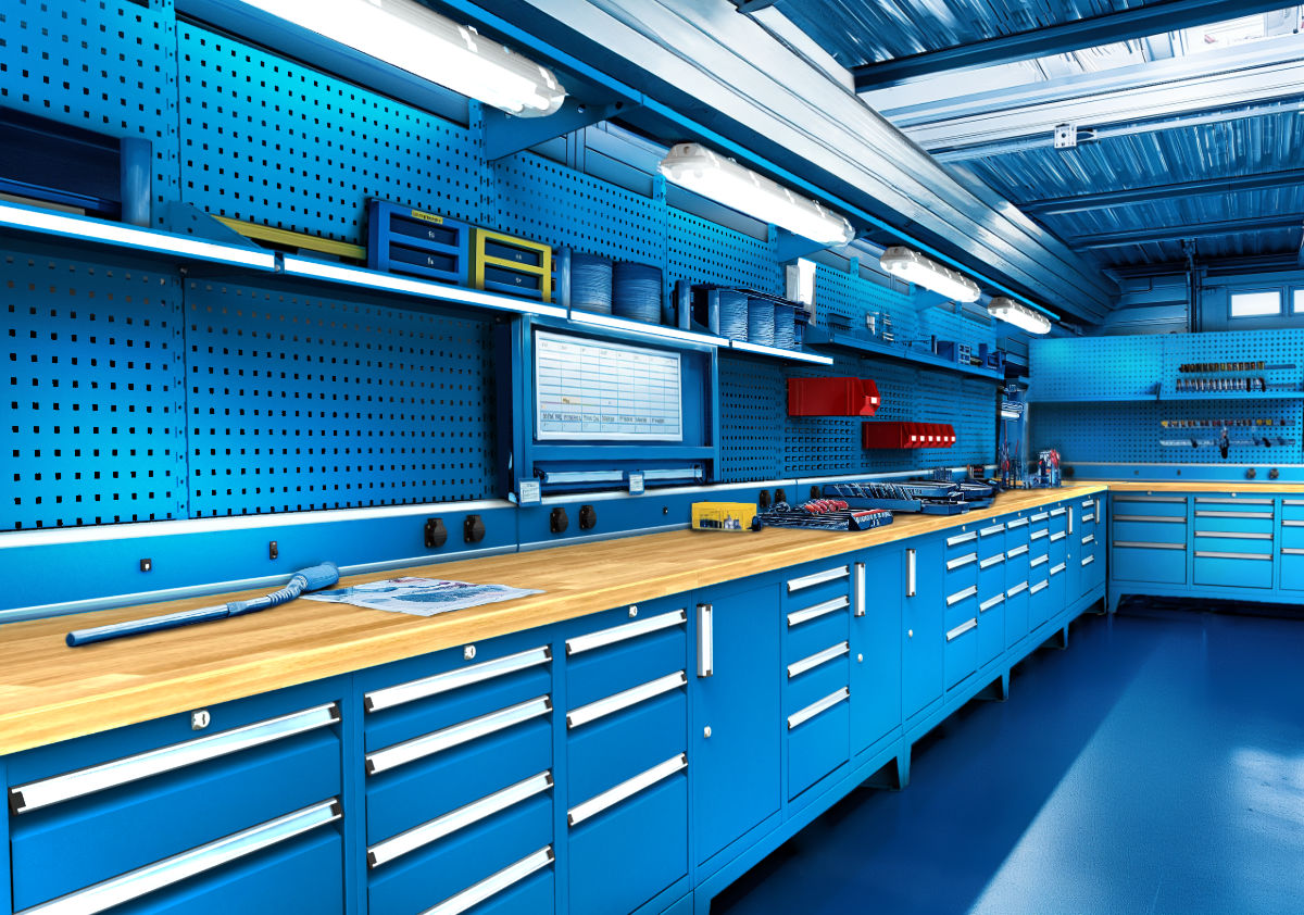 Profesionální dílenské ponky s úložným prostorem: Kombinace pracovní desky se zásuvkami a skříňkami pro efektivní organizaci nářadí a materiálu.