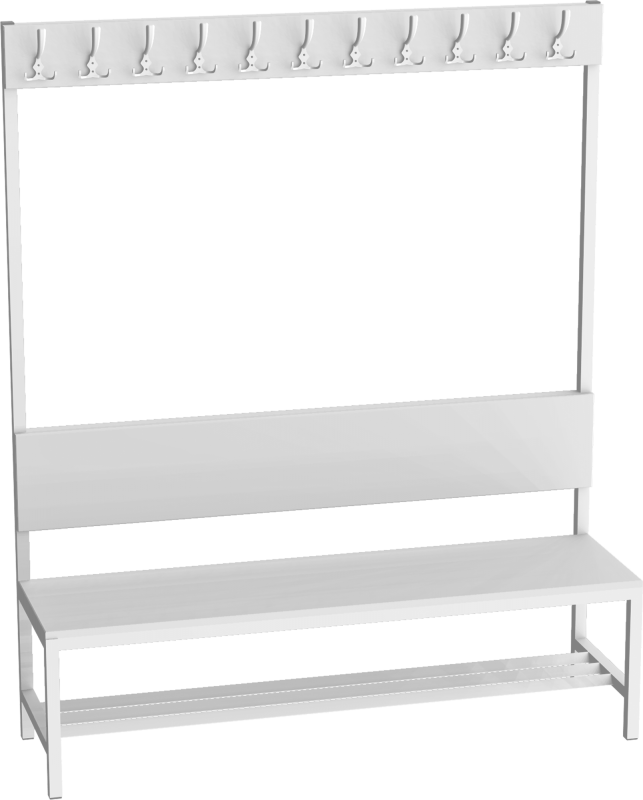 Jeklová masivní šatnová lavice s 11 věšáky, opěradlem, roštem na boty a sedákem. Lavice je určená pro vnitřní interiéry šaten škol, průmyslových podniků, zdravotnických zařízení apod.Korpus lavice je vyroben z ocelových profilů 30 x 30 mm, nohy jsou opatřeny plastovými kluzáky. Sedací plocha, příp. opěradlo jsou vyrobeny z šedé 18 mm laminované dřevotřískové LTD desky s 2 mm ABS hranou. Deska pro uchycení věšáků je ocelová a věšáky nýtované, eliminuje se tím vytržení háčku z desky.