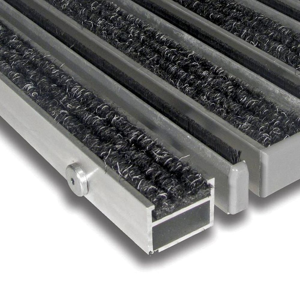 Základem rohože Alu Extra jsou hliníkové profily o šířce 27 mm, které jsou spojeny nerezovým lankem a odděleny pryžovými mezikroužky, tím je umožněno stáčení rohože a jednodušší manipulaci při úklidu. Do hliníkových profilů se fixují gumové nebo textilní pásky, které lze libovolně kombinovat a po opotřebení vyměnit. Mezi hliníkové profily je navíc možné vložit hliníkovou škrabku ve tvaru "Y" nebo kartáčový profil. Nejčastější použití vstupní čistící zóny vstupní prostory letišť, hotelů, bank, restaurací, administrativních budov únikové východy Varianty Následující varianty je možné libovolně kombinovat. Všechny dostupné varianty materiálu i barev je možné nalézt ve fotogalerii. hliníková škrabka (samostatný kus): používá se jako 1. čistící zóna pro odstranění hrubé nečistoty (kamínky, bahno, atp.) kartáčový profil (samostatný kus): použití jako hliníková škrabka guma (výplň alu profilu): používá se ke stejným účelům jako škrabka kartáčový pásek (výplň alu profilu): používá se ke stejným účelům jako škrabka textil (výplň alu profilu): používá se jako 2. čistící zóna pro odstranění jemných nečistot (voda, prach) Kartáčkový pásek je možné zakoupit v černé, bílé a hnědé barvě, viz fotogalerie. Textilní alu výplň je možné zakoupit v následujících barvách: černá, šedá, světle modrá, tmavě modrá, žlutá, eben, tmavě hnědá, zelená, mořská zelená a červená. Technický popis varianta: kombinace textiní (černá) + kartáčový profil délka: 100 cm - délka plochy, která čistí obuv ve směru chůze šířka: 100 cm - délka proužků, někdy též šířka dveří výška: 2,7 cm hmotnost: 15 až 17 kg / m? (dle provedení) zatížení: do 8,5 t / 100 cm? Montáž / instalace Rohož je možné v úrovni podlahy uložit do připraveného otvoru osazeného hliníkovým / nerezovým rámem šířky 30, výšky 30 a tloušťky 3 mm. Rohož je taktéž možné volně položit spolu s náběhovým rámem širokým 65 mm, popř. 45 mm pro rohože do max. délky 120 cm.