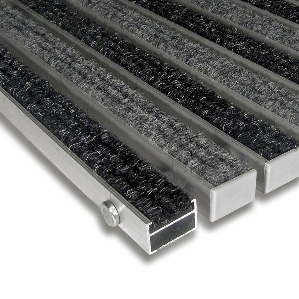 Základem rohože Alu Standard jsou hliníkové profily o šířce 27 mm, které jsou spojeny nerezovým lankem a odděleny pryžovými mezikroužky, tím je umožněno stáčení rohože a jednodušší manipulaci při úklidu. Do hliníkových profilů se fixují gumové nebo textilní pásky, které lze libovolně kombinovat a po opotřebení vyměnit. Nejčastější použití vstupní čistící zóny vstupní prostory hotelů, bank, restaurací, administrativních budov únikové východy Varianty Následující varianty výplní hliníkových profilů je možné libovolně kombinovat. Všechny dostupné varianty materiálu i barev je možné nalézt ve fotogalerii. guma (palička): používá se jako 1. čistící zóna pro odstranění hrubé nečistoty (kamínky, bahno, atp.) textil: používá se jako 2. čistící zóna pro odstranění jemných nečistot (voda, prach) Textilní variantu je možné zakoupit v následujících barvách: černá, šedá, světle modrá, tmavě modrá, žlutá, eben, tmavě hnědá, zelená, mořská zelená a červená. Technický popis varianta: textilní (černá, šedá) délka: 600 mm - délka plochy, která čistí obuv ve směru chůze šířka: 900 mm - délka proužků, někdy též šířka dveří výška: 2,2 cm hmotnost: 7,6 kg zatížení: do 7 t / 100 cm? Montáž / instalace Rohož je možné v úrovni podlahy uložit do připraveného otvoru osazeným hliníkovým / nerezovým rámem šířky 25, výšky 25 a tloušťky 3 mm. Rohož je taktéž možné volně položit spolu s náběhovým rámem širokým 65 mm, popř. 45 mm pro rohože do max. délky 120 cm.